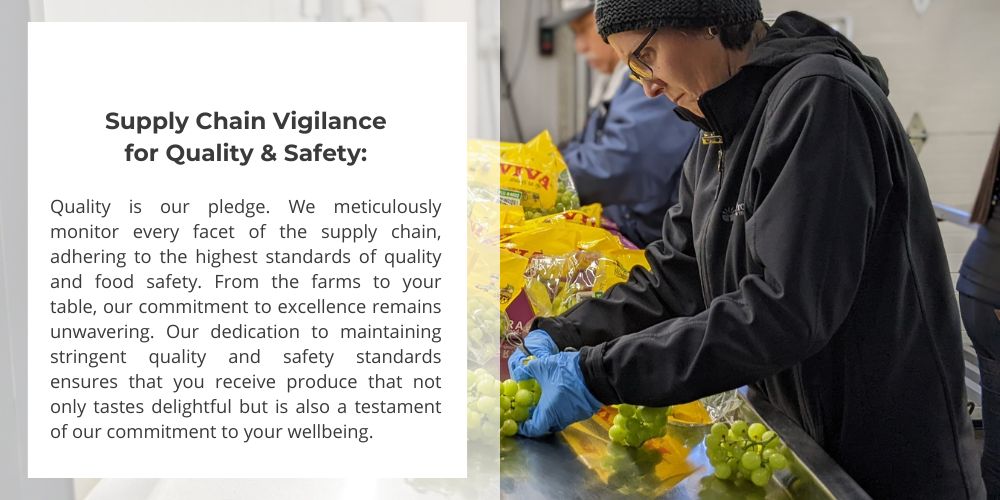Quality is our pledge. We meticulously monitor every facet of the supply chain, adhering to the highest standards of quality and food safety. From the farms to your table, our commitment to excellence remains unwavering. Our dedication to maintaining stringent quality and safety standards ensures that you receive produce that not only tastes delightful but is also a testament of our commitment to your wellbeing.