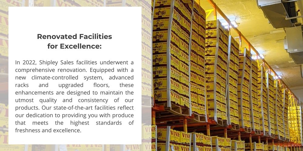 In 2018, Shipley Sales' facilities underwent a comprehensive renovation. Equipped with a new climate-controlled system, advanced racks and upgraded floors, these enhancements are designed to maintain the utmost quality and consistency of our products. Our state-of-the-art facilities reflect our dedication to providing you with produce that meets the highest standards of freshness and excellence.
